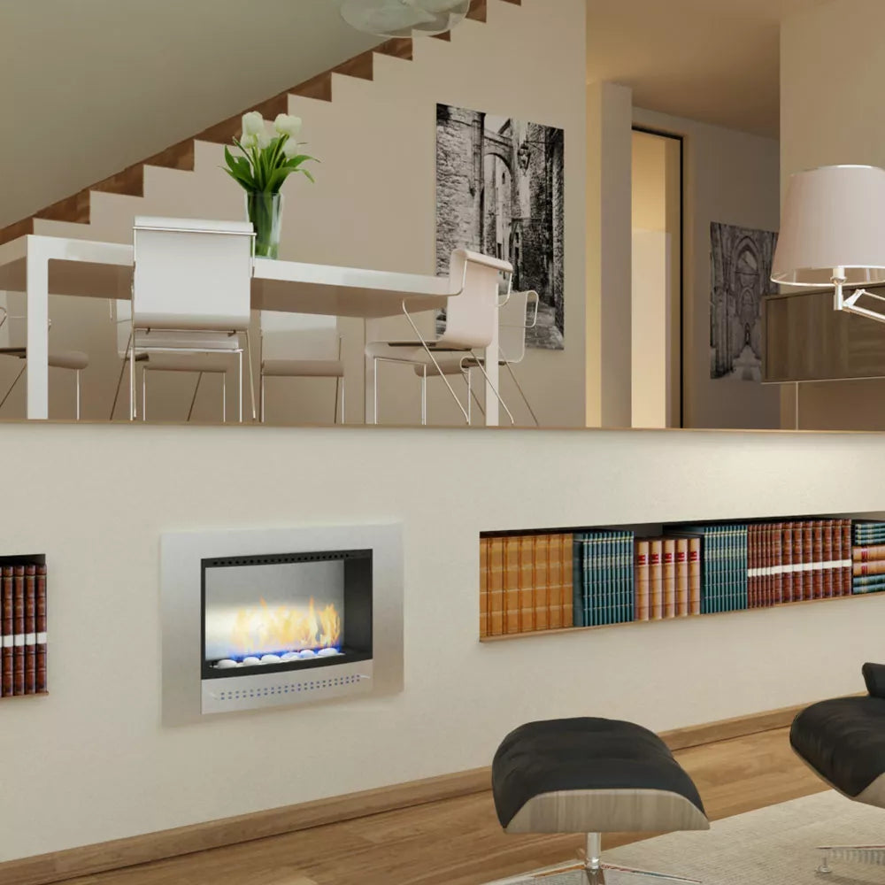 An easy Installation allows you to either hang the fireplace on the wall or recess it to sit flush with the wall.