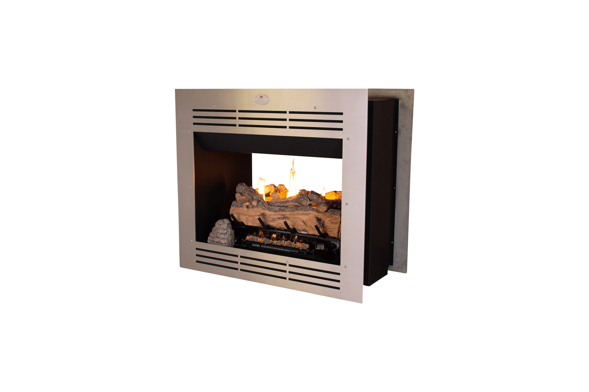 Firebox Vent Free Double Sided Model 940 Stainless Steel Facade with Split Oak Logset