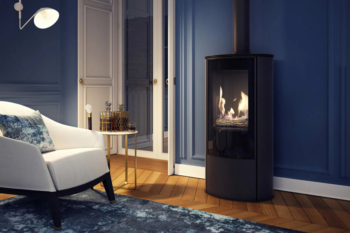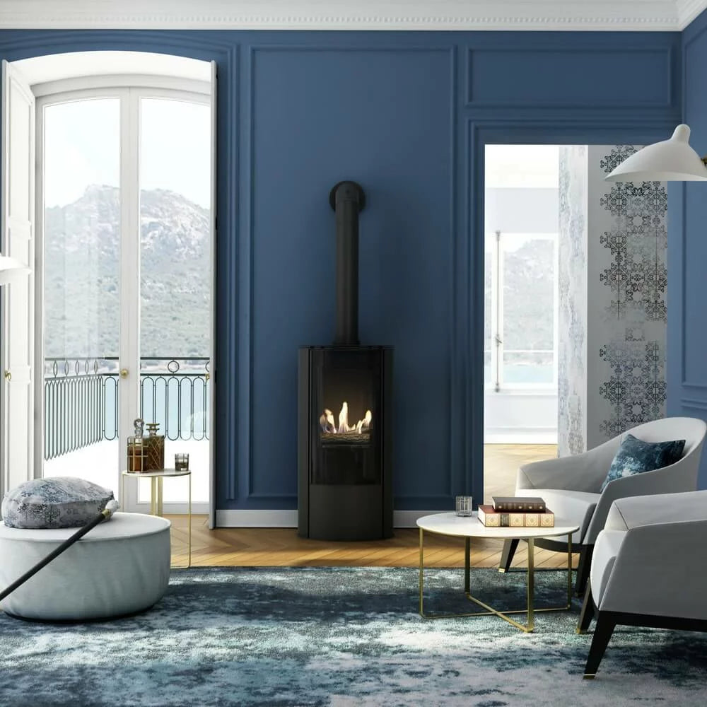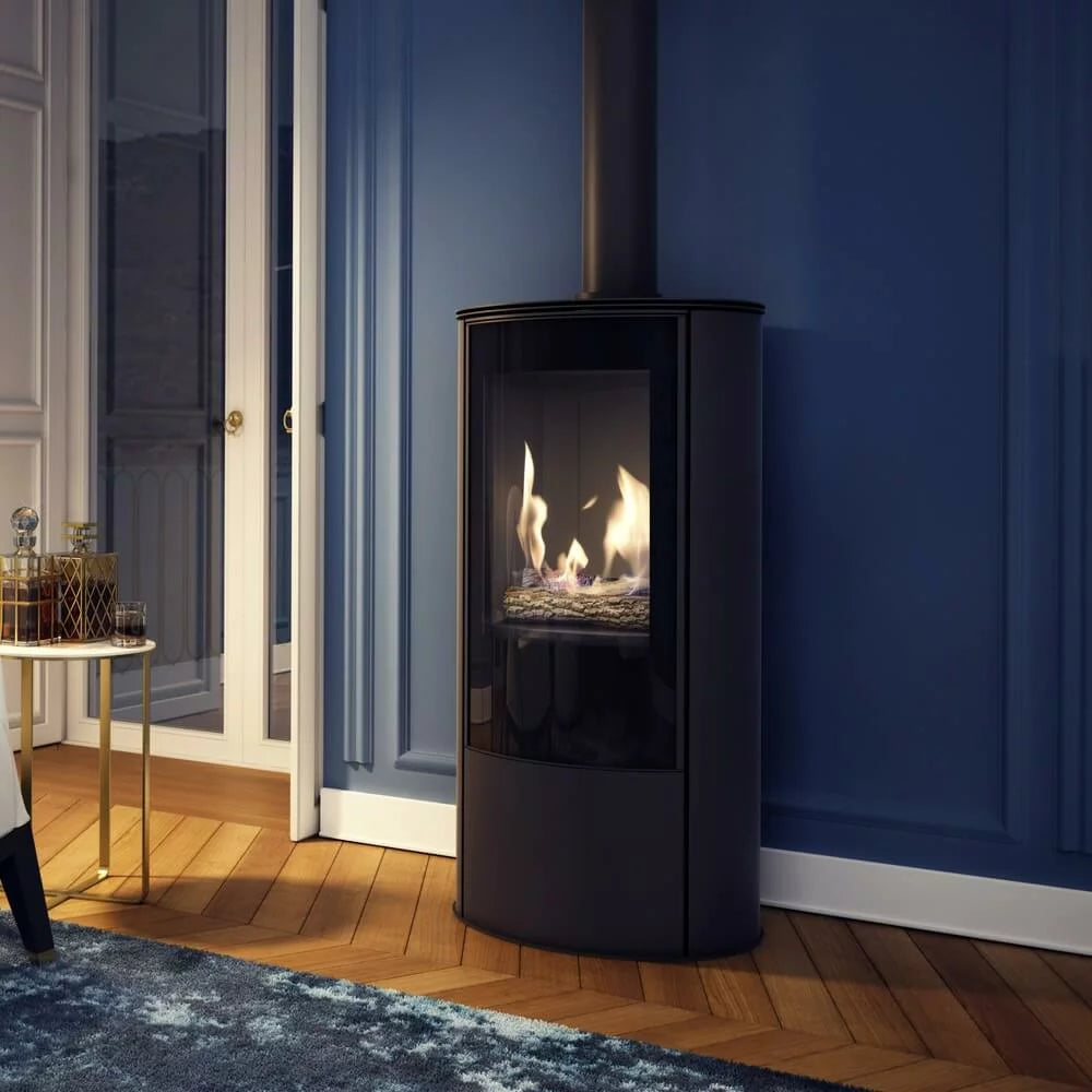The AB/S Gas is modern and luxurious closed-combustion freestanding gas fireplace. This feature fireplace offers a sleek, minimalistic design with blackened glass framing the view of the fire. The coaxial flue pipe systems ensure that this gas fireplace is a sealed and safe system. The sleek design comes with a digital hand held remote and realistic ceramic logs.