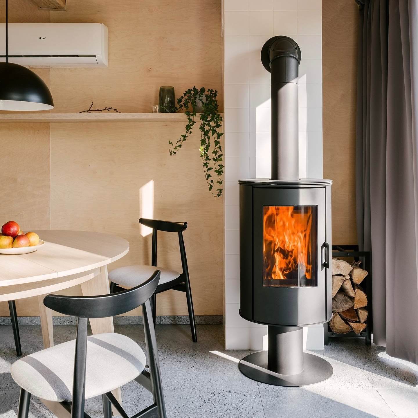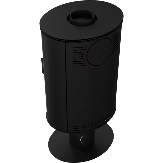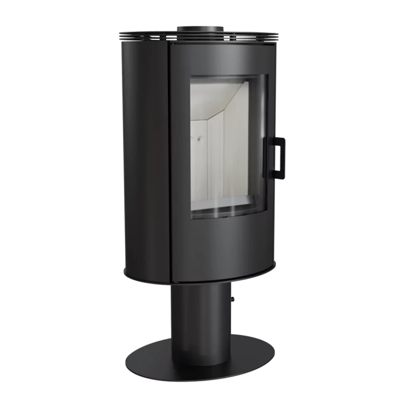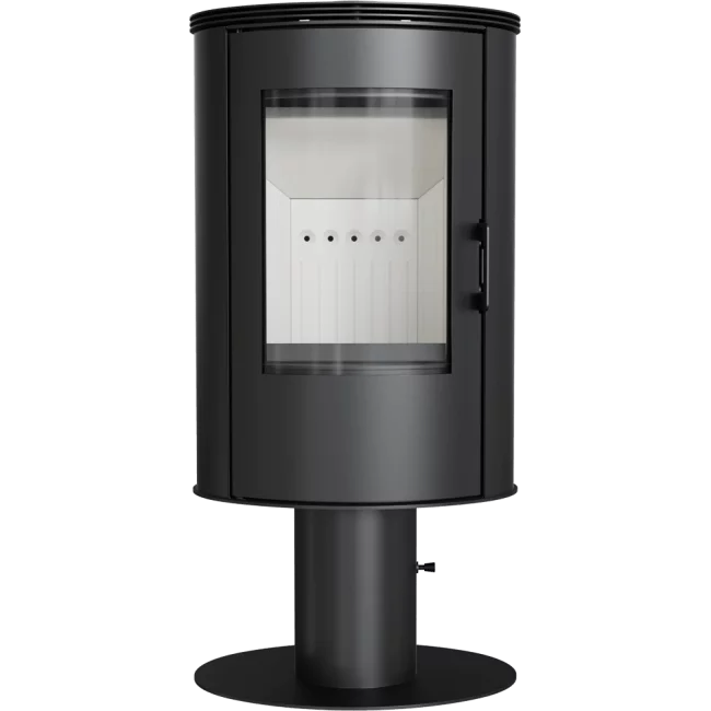 The Kratki AB/SN is a modern, compact and cylindrical unit on a pedestal. Its most impressive feature is its curved glass door that allows for a wide-angle view into the fire. Highly refractory ceramics line the combustion chamber to drastically increase the overall performance of the fireplace.