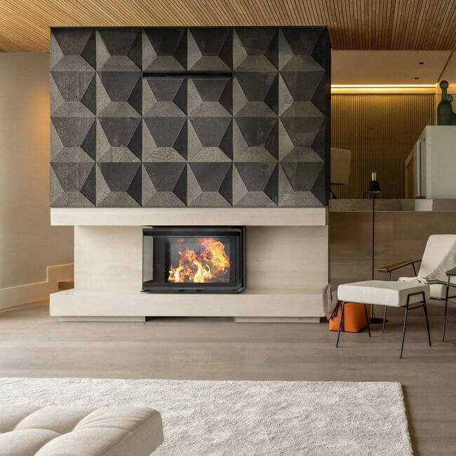 The burn chamber is lined with Kratki’s signature ceramics. When it comes to the choice of materials that can be used inside a fireplace chamber, these thick, heat-intensifying ceramics offer the best thermal properties available. With very impressive technical specifications, this closed-combustion fireplace is an excellent heating solution for anyone looking for a high-performance, modern, built-in unit.