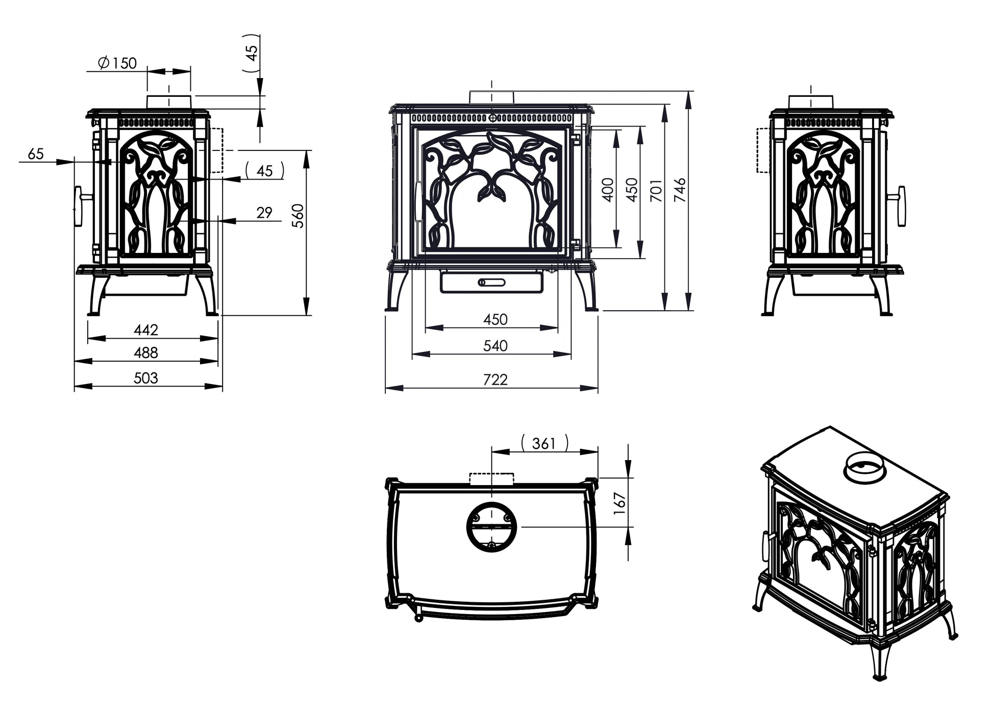 | SIDE GLASS PANEL | Increases vision of fire |