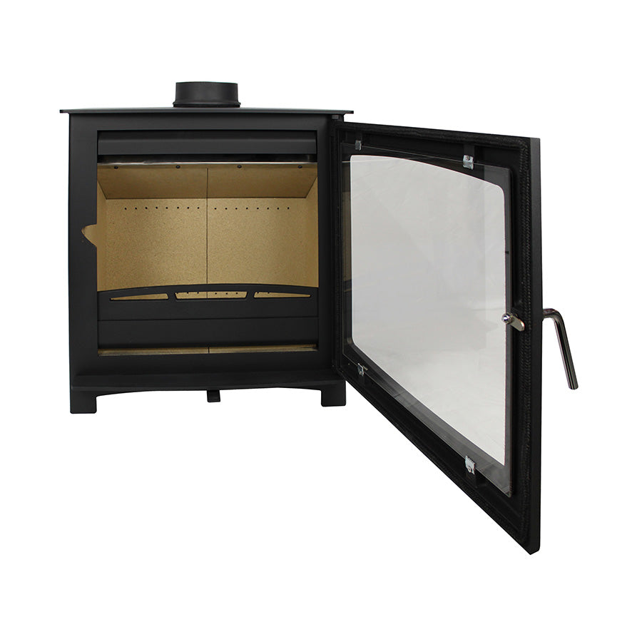 The combustion chamber is lined with vermiculite firebrick and comfortably loads 45cm logs. There is a vermiculite flatbed for burning wood with no need for an ashpan. The removable baffle plate has both a steel and vermiculite layer for extra durability and heat radiation. There is also an option to connect to an external air source. The rear of the stove features a convection panel. Included is a glove for opening the door and adjusting the air lever, and an instruction manual.