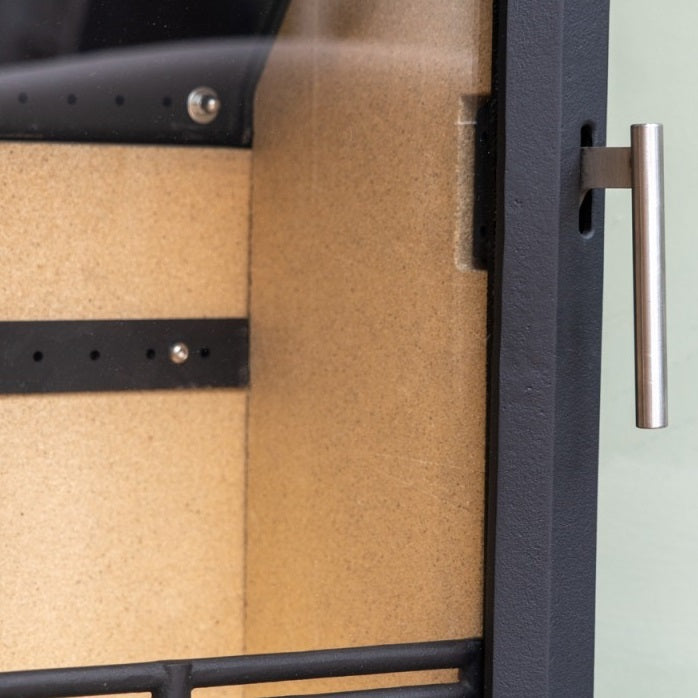 The Vista 500 features a 10mm thick steel top; 5mm thick steel sides and a removable, steel baffle plate. The vermiculite lining the combustion chamber is 30mm thick and the chamber comfortably loads 25cm logs The Hampton Vista 500 is a wood-burning only fireplace and therefore doesn’t require a grate or an ash pan, as wood loves to burn on a flat base. On the side of the fireplace is a well-engineered dial which gives an incredibly accurate degree of control over the fire and the vent plate that is mechanically attached to the body. There is an option to connect to an external air intake. Included are an instruction manual and a glove for adjusting the dial and for opening the door.