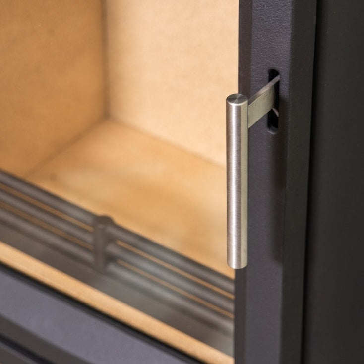 The Ecosy+ Hampton Vista 500 is one of the most up-to date fireplaces on the market. Its modern design boasts a large window in a stylishly shaped, 30mm thick, cast-iron door that is mirrored with a matching, thick, cast-iron fascia fixed to the integrated log stand. It comes with a newly designed, brushed chrome, push/pull handle, and a chrome dial.