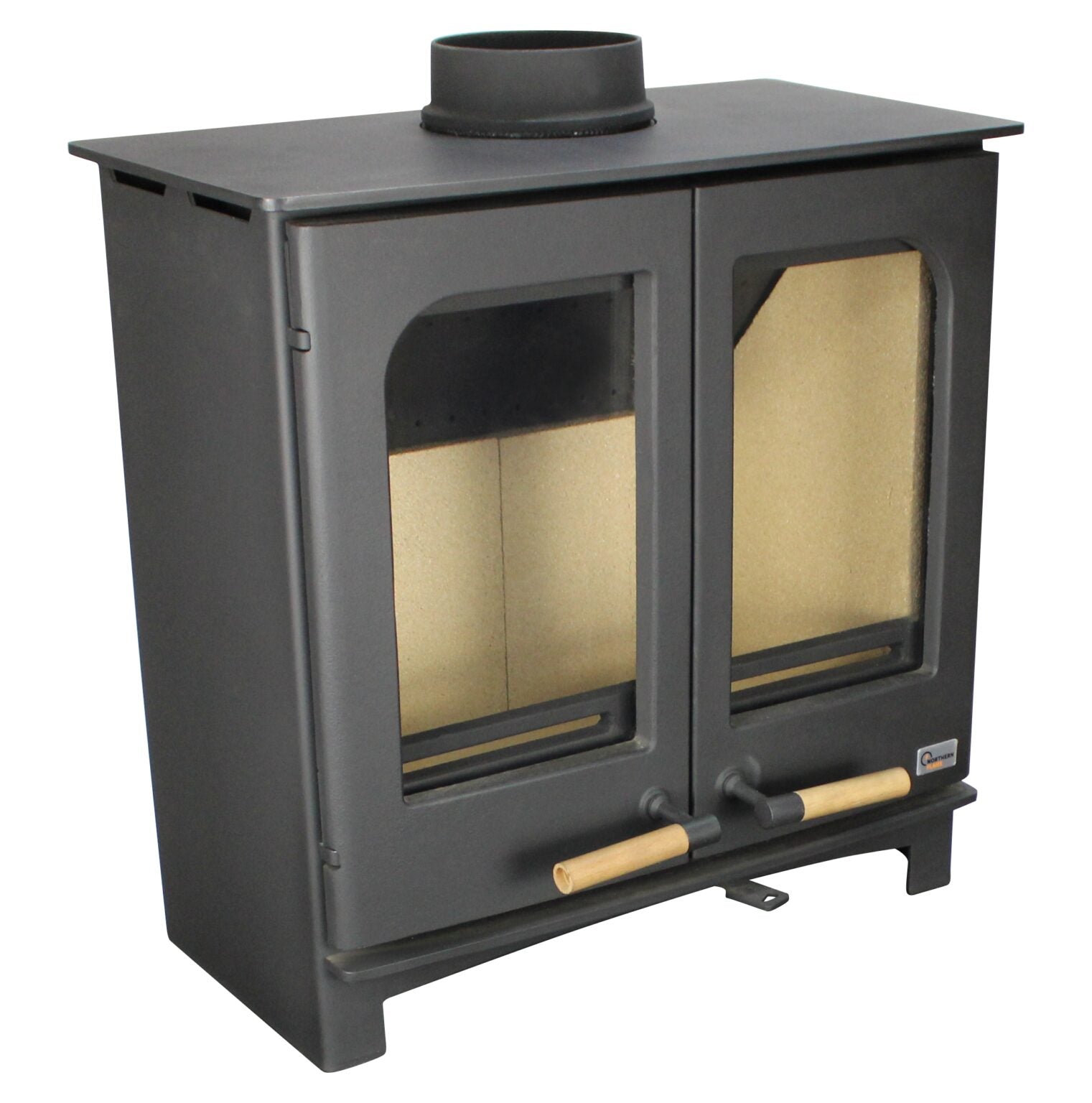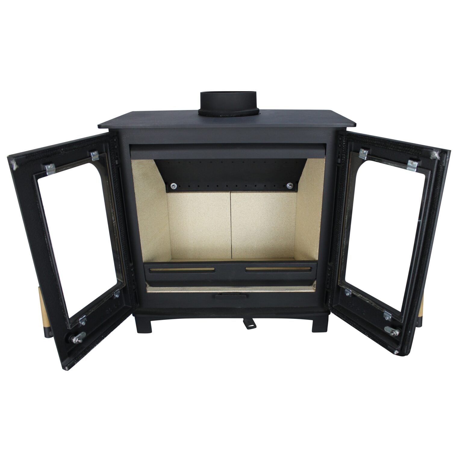 It features a 30mm thick cast iron doors; a 10mm thick steel top; a 5mm thick steel body and a removable baffle plate design. The vermiculite lining the combustion chamber is 30mm thick and the chamber comfortably loads 30cm logs. The Panoramic Twin Door is a wood burning only stove and therefore doesn’t require a grate or an ash pan, as wood loves to burn on a flat base. Adjustable bolts on the legs aid with levelling on uneven surfaces and there is an option to connect to an 100mm external air intake. Included are an instruction manual and a glove for adjusting the air control and for opening the door.