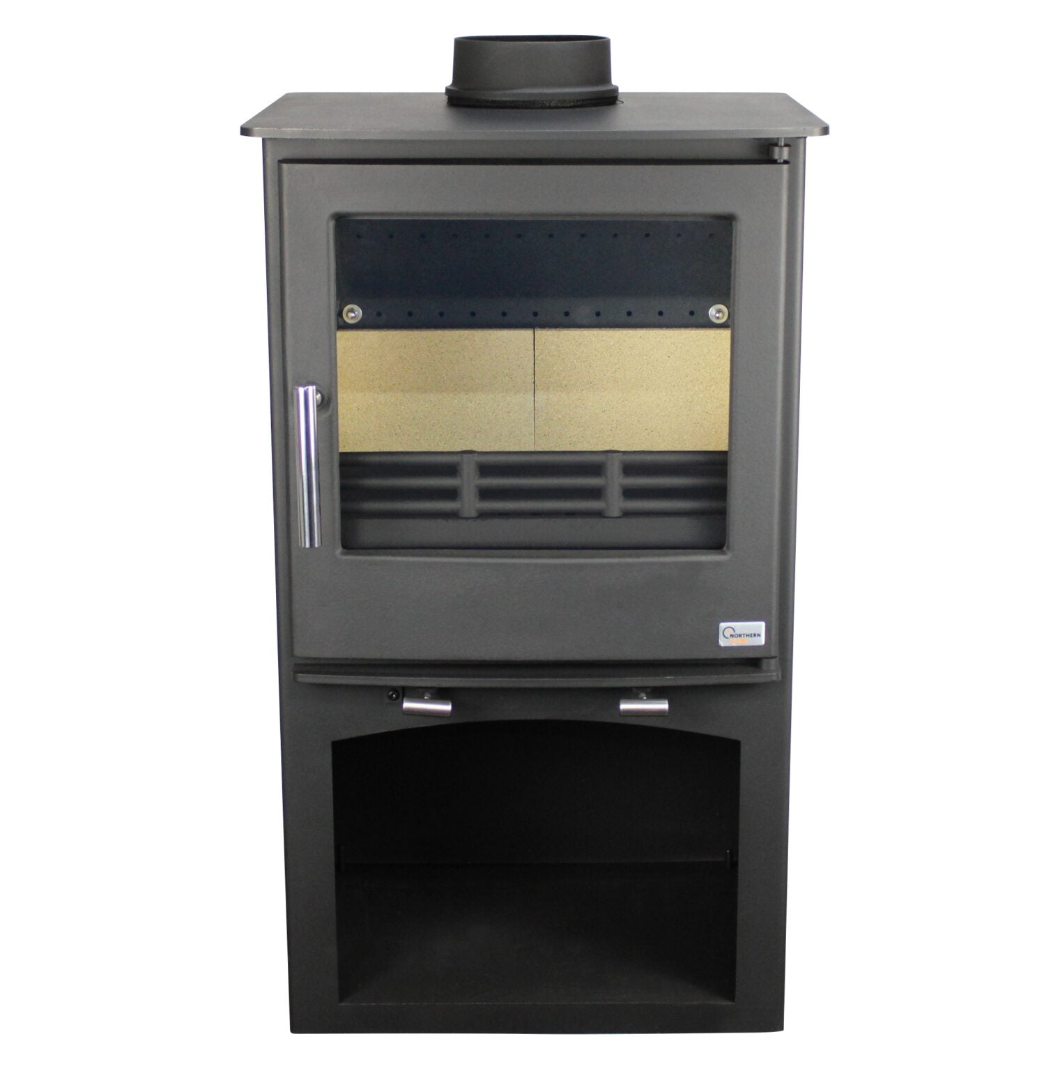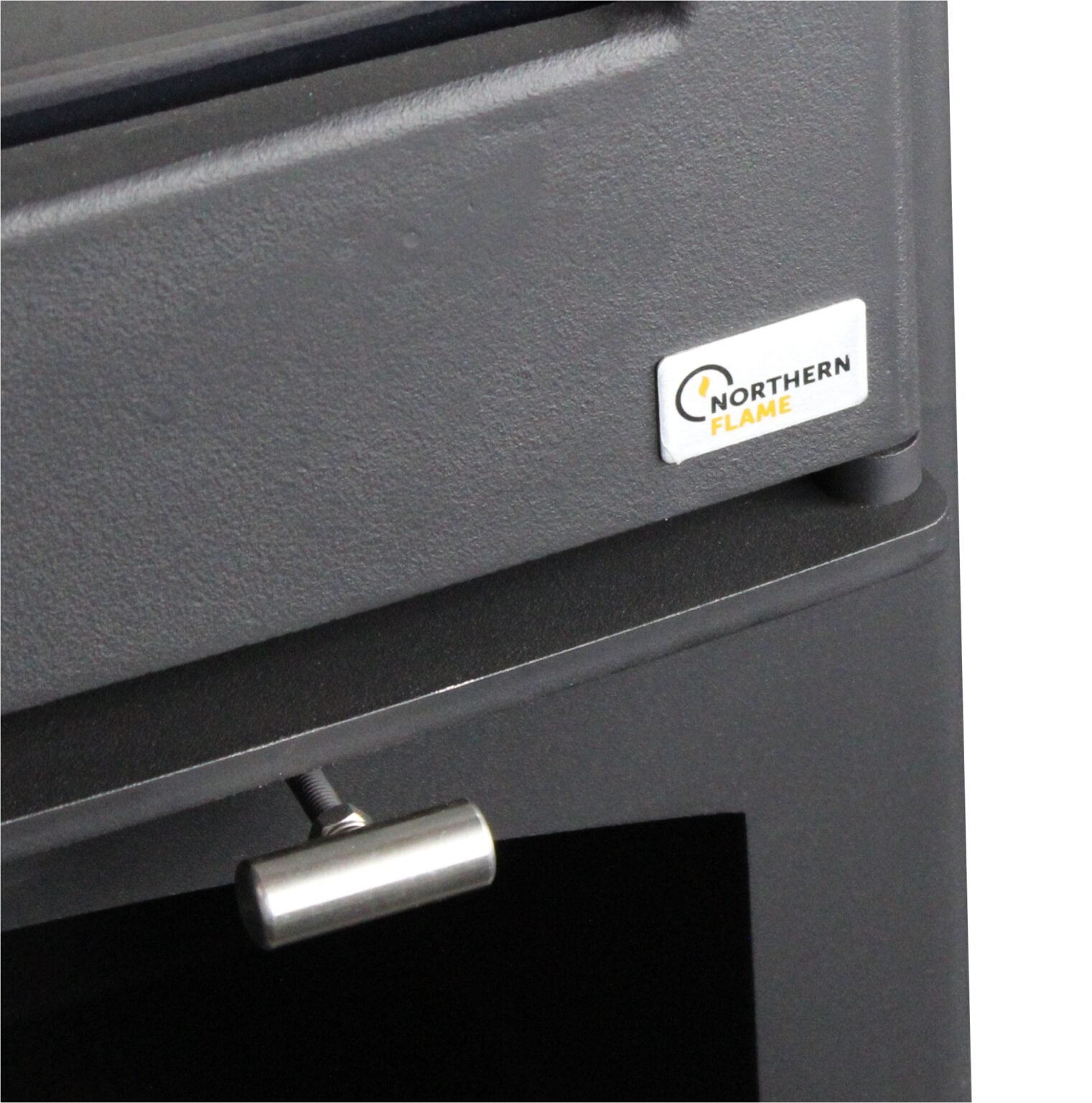 It features a 30mm thick cast iron door, a thick steel body and a unique, removable, steel baffle plate design. The vermiculite lined combustion chamber comes with a removable, galvanised ash pan (with all 4 corners folded) and comfortably loads 30cm logs. Adjustable bolts on the stand aid with levelling on uneven surfaces and there is an option to connect to a direct air feed through an external air intake. Included are an instruction manual; a glove for adjusting the air inlets and for opening the door, 2 cast iron grates – 1 flat wood grate and 1 multifuel grate, and a tool for removing the ash pan. The combustion chamber’s dimensions are 38cm (W) x 30cm (H) x 25.5cm (D). The large window’s dimensions are 30.5cm x 33.5cm.