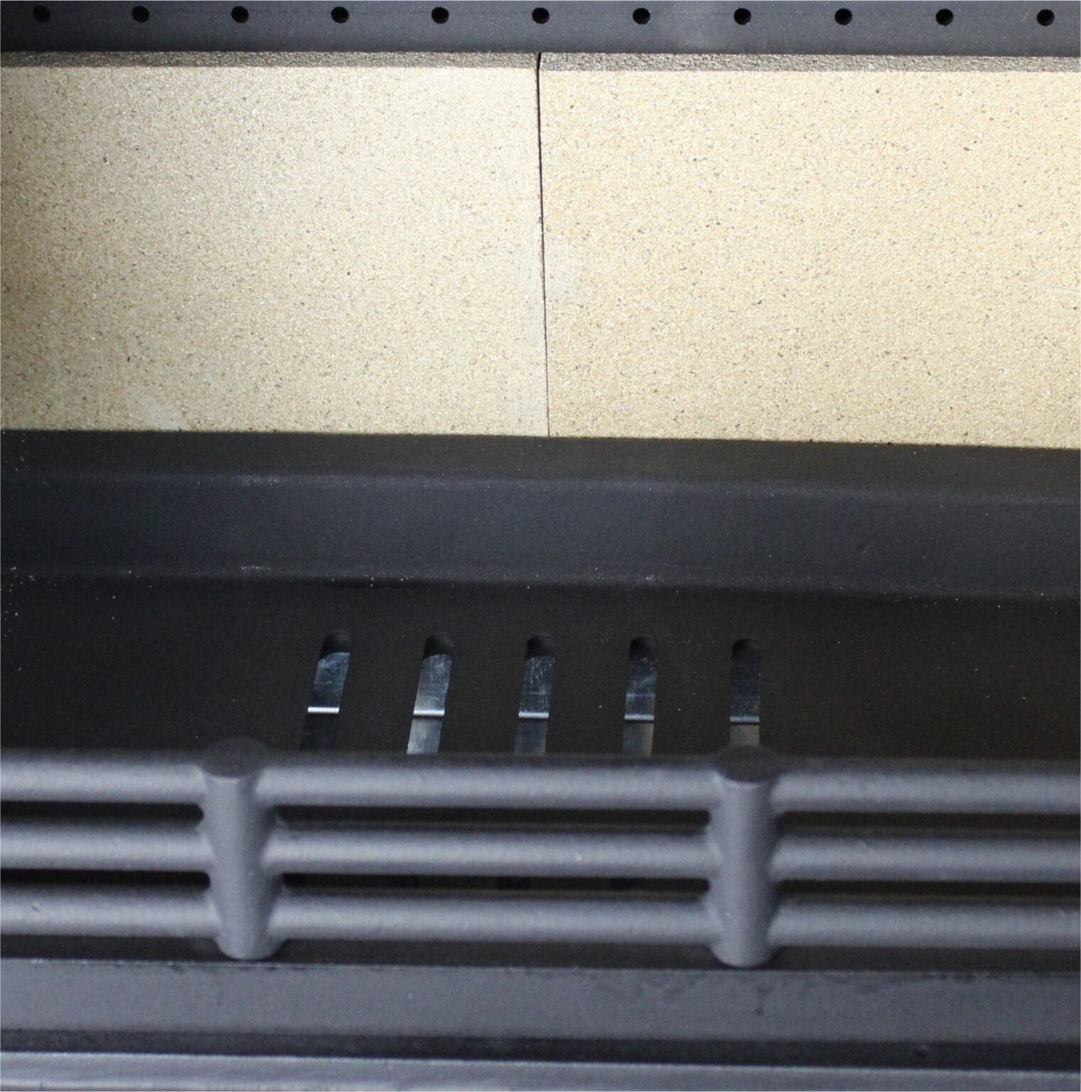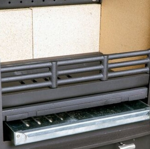 The Snug burns both wood and smokeless coal. For wood, which prefers a flat bed with air flowing over the top, the air controls can completely cut off the primary air under the fire with the left lever, whilst leaving the secondary / tertiary air open with the right lever. To burn smokeless coal, this grate slips out and the permeable, coal grate slips in. The airholes in the coal grate allow the ash to fall through and the air controls allow the primary air to be fully open letting air rush under the fire whilst the secondary / tertiary air is almost fully cut off independently.