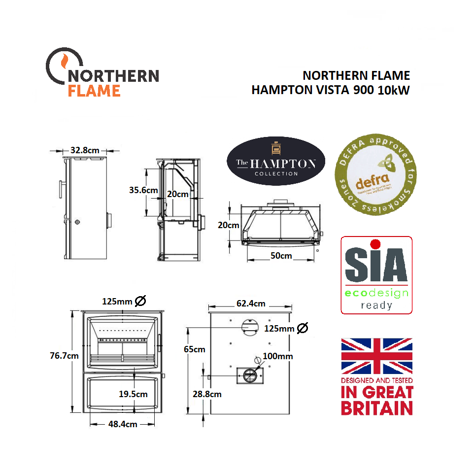 The Hampton Vista 900 is a high-end product which has been rigorously tested. It exceeds the SIA 2022 Eco-Design requirements & it comes with a DEFRA certification. It is manufactured according to European design in China for the U.K. market. It is CE and British standard approved by KIWA Gastec and comes with a 5-year limited warranty.
