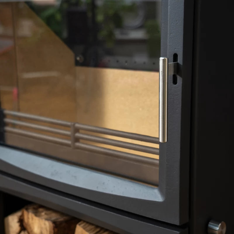 The Hampton Vista 900 is one of the most up-to date fireplaces on the market. Its modern design boasts a large window in a stylishly shaped, 30mm thick, cast-iron door that is mirrored with a matching, thick, cast-iron fascia fixed to the integrated log stand. It comes with a newly designed, brushed chrome, push/pull handle, and a chrome dial.