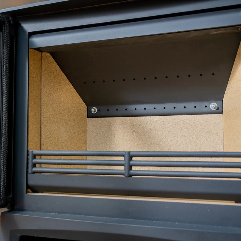 The Hampton Vista 900 is a “hybrid” fireplace, and its body is constructed from quality Q235B carbon steel that has been chosen for its plasticity, weldability, and toughness. It’s effectively ‘a stove within a stove’, where the air drawn in from the rear is fed between two layers of steel. The air is then dispersed over the fire from a series of holes high inside the rear of the chamber. This re-introduced Tertiary air re-burns the initial smoke and pollutants created by the fire. The remaining air speeds up as it rises over the fire and is released like a curtain of heat that burns the glass clean (Air Wash technology).