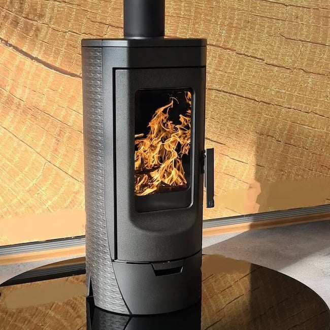 The Tara captures attention with its circular shape and modern design. The vertical glass door offers a beautiful view of the flames when burning. Weighing an impressive 85 kg for its compact size, the Tara is durable and tough. With modern technology, it stands out for its high efficiency rating of 84% and an A+ energy class rating. Designed for small to medium-sized rooms, this fireplace provides 8 kW of heat – perfect to keep you nice and cosy!