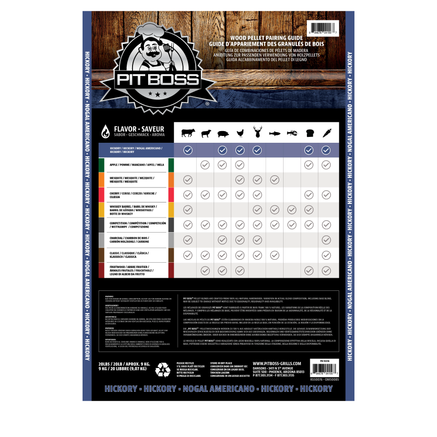 Bring big, bold flavour to your next barbecue with a hardwood pellet blend that’s favoured by many seasoned pitmasters. Pit Boss® Hickory Blend Hardwood Pellets produce a strong aromatic smoke to perfectly complement beef, pork, poultry, and vegetables. Hickory is a popular choice for smoking because it packs a stronger flavour than most cooking woods, making it an ideal option for low and slow beef and pork. Savor 100% all-natural smoky flavour when you fuel up with our pellets, which are always free from added scents, sprays, chemicals, or glues.